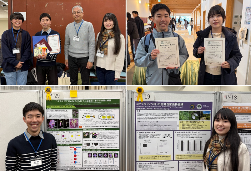 また、深野哲也さんの発表と、同研究室の田島結奈さん(博士前期課程1年次)の発表が、Plant Species Biology(PSB)編集委員会が選ぶ「PSB推しポスター」に選ばれました。田島さんの発表は「コナミキ(シソ科)の自動自家受粉機構」というタイトルで、絶滅危惧種であるコナミキが、開花前に自動自家受粉を行う一方で、自家受粉に失敗した花は開花期間を延ばすことで、外交配の機会を確保していることを明らかにしたものです。